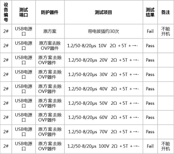 某客戶的智能手持式POS機,使用的是USB口作為整機的電源輸入口,在使用過程中,經(jīng)過數(shù)次帶電拔插,設(shè)備就不能開機了,電源輸入異常。拆機,測量USB電源兩端為短路,查出為OVP芯片短路所致。由于去除了OVP器件,客戶擔(dān)心實際使用過程中會存在應(yīng)用風(fēng)險。故,提出EOS滿足200V的測試要求。