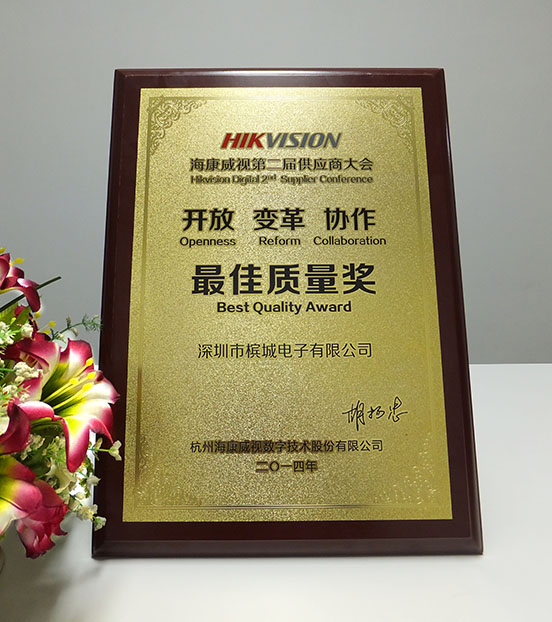 2014年,檳城電子憑借優(yōu)質(zhì)的產(chǎn)品和完善的服務(wù),在??低暤墓?yīng)商大會(huì)上喜獲“最佳質(zhì)量獎(jiǎng)”的榮譽(yù),這對(duì)一直在努力的檳城人是一個(gè)莫大的鼓舞,我們的汗水沒有白流,我們付出得到了收獲,全體檳城人將再接再厲,創(chuàng)造出更加美好的明天!