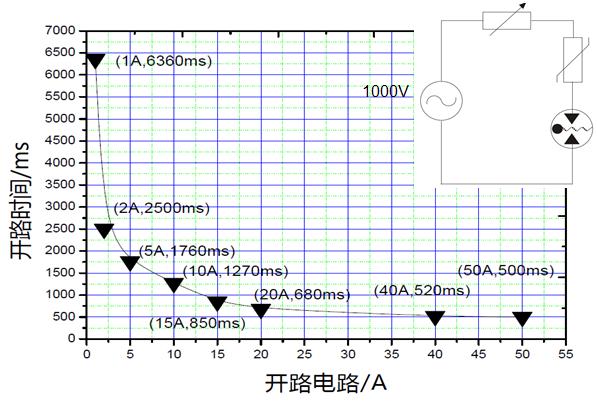 開路失效氣體放電管可以滿足這三點(diǎn)性能,且可以在工頻過來時(shí)很快切斷電路,如下圖為開路失效氣體放電管的工頻電流和斷開時(shí)間測(cè)試曲線: