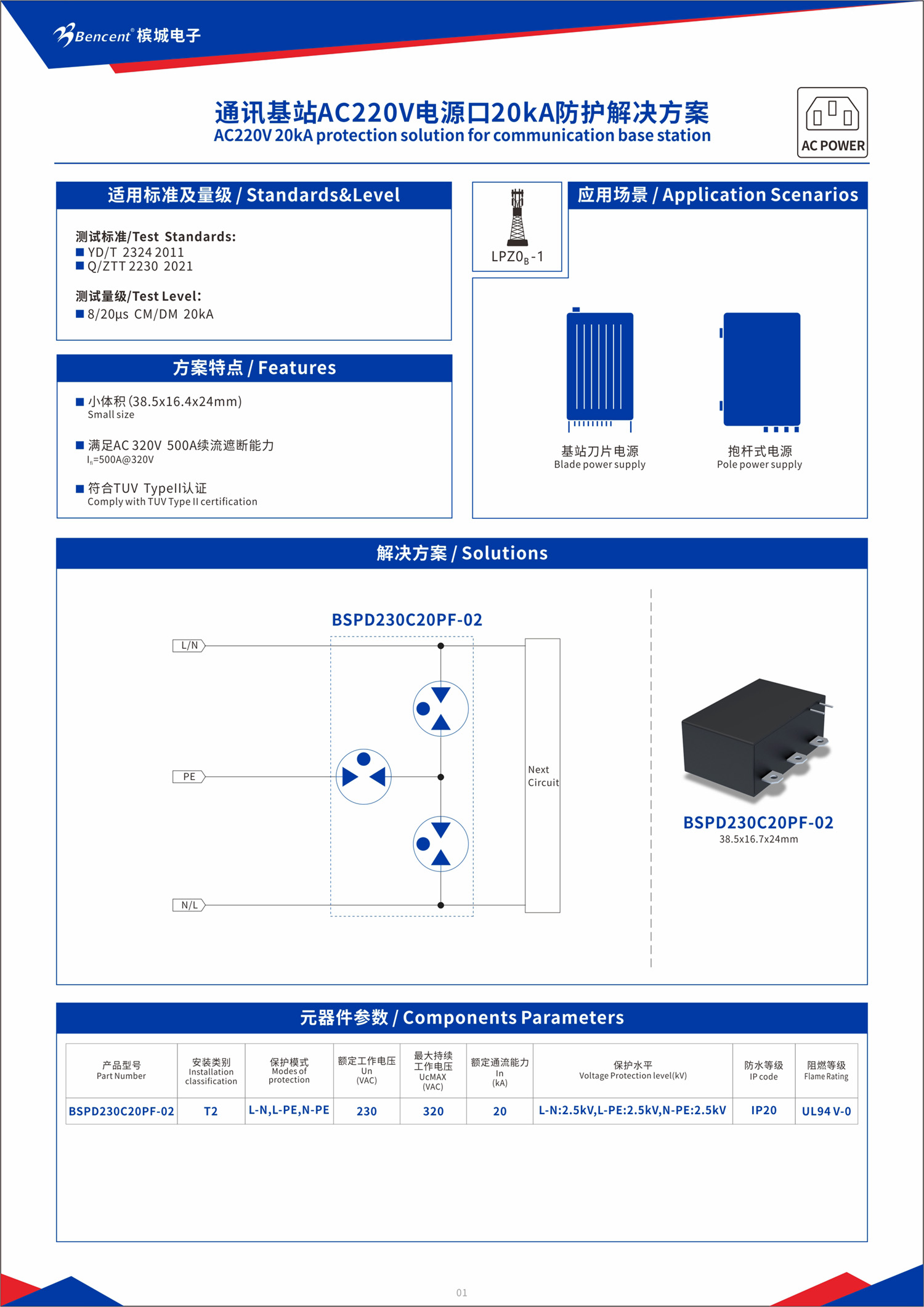 針對電網的異常干擾,我們提供了高通流密度的防雷模塊BSPD230C20PF02: