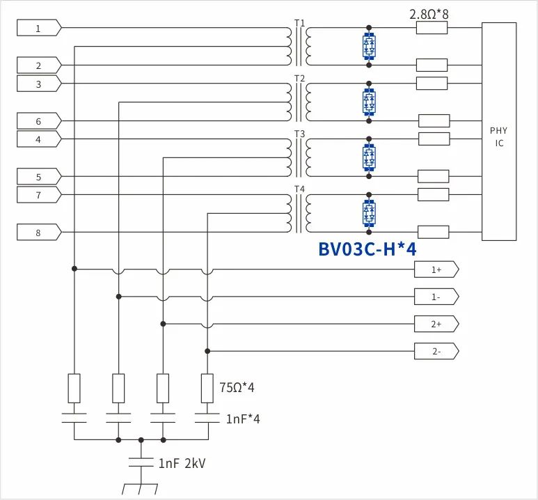 根據(jù)測試要求,對于外部的網(wǎng)口,最大能量為共模 6kV 7Ω的測試要求,電流大約為850A,能量相對較大,需要多個(gè)器件共同承擔(dān);根據(jù)標(biāo)準(zhǔn)的要求,測試完后需要滿足DC500V大于2MΩ的絕緣阻抗要求。