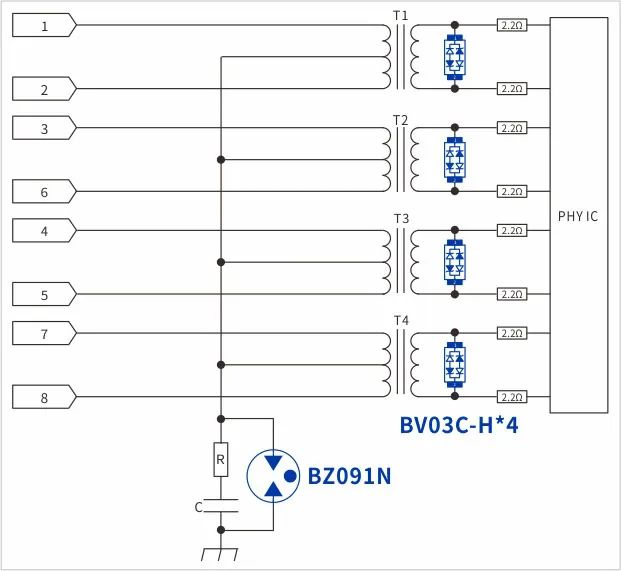 網(wǎng)口防護(hù)電路大致如(圖1),客戶初級側(cè)共模浪涌采用90V的GDT——BZ091N,次級采用低容BV03C-H做差模防護(hù),抑制浪涌或ESD電壓尖峰。 客戶反饋共模浪涌10/700us 6kV測試可以通過,端口ESD空氣15KV測試設(shè)備死機需重啟。通過溝通得知,板子面積較小空間受限,CPU與phy都靠近RJ45端口,布局大致如(圖2)。