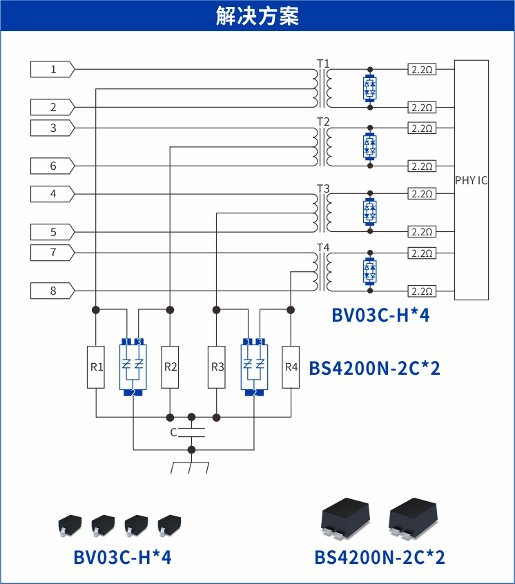 第二級防護,為滿足千兆網(wǎng)口高速數(shù)據(jù)傳輸對防護器件性能參數(shù)設(shè)計要求,檳城電子推薦使用低容ESD器件BV03C-H,工作電壓 3.3V,結(jié)電容1.5pF,峰值脈沖電流25A,采用SOD323封裝,并符合IEC 6100-4-2 (ESD)±30kV (空氣放電) 和±30kV (接觸放電) 標準。該方案在75℃高溫環(huán)境下能保證數(shù)據(jù)傳輸無丟包,可吸收差模浪涌殘余能量,有效保護PHY,同時后級可以串接2.2Ω電阻作為退耦器件,阻礙浪涌或ESD電流往后級流動迫使BV03C-H快速充分地導通。