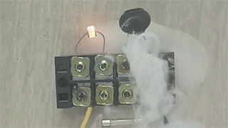 視頻1:回路中加電1000V,20A時(shí),15A的保險(xiǎn)絲無法動(dòng)作,壓敏起 火燃燒。